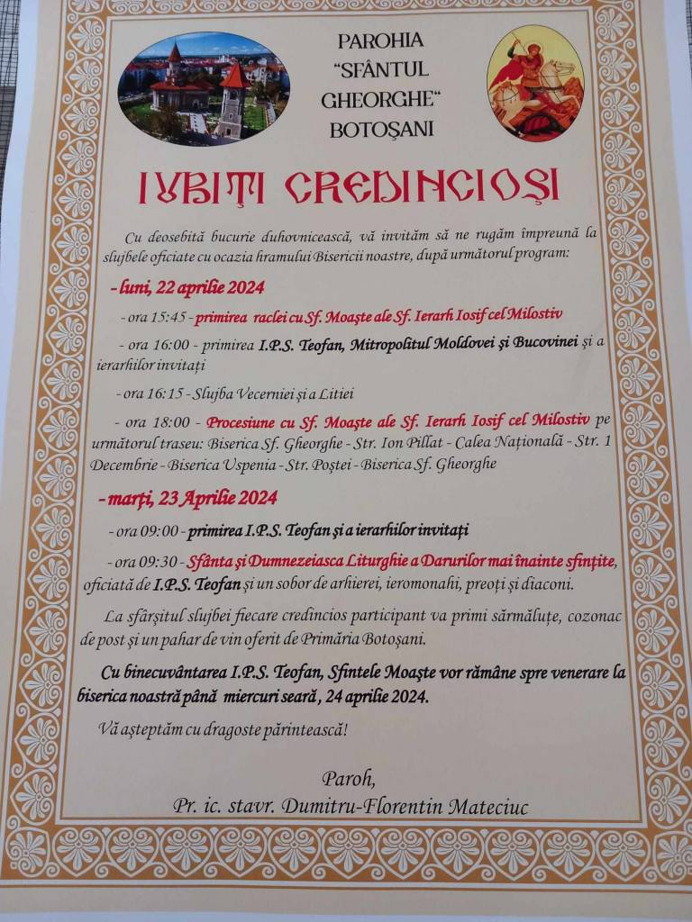 Sărbătoarea Sfântului Mucenic Gheorghe, ocrotitorul municipiului Botoșani, aduce anul acesta bucurii duhovnicești deosebite credincioșilor din oraș. Cu binecuvântarea Înalt Preasfințitului Teofan, mitropolitul Moldovei și Bucovinei, vor fi aduse spre închinare la Biserica Sfântul Gheorghe din municipiu moaștele Sfântului Ierarh Iosif cel Milostiv, Mitropolitul Moldovei.