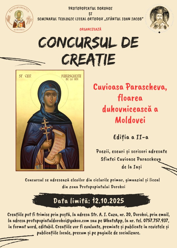 Protopopiatul Dorohoi, prin Biroul de catehizare și Centrul educațional, și Seminarul Teologic Liceal Ortodox „Sfântul Ioan Iacob” Dorohoi organizează, în perioada septembrie – octombrie 2025, Concursul de creație literară „Cuvioasa Parascheva, floarea duhovnicească a Moldovei”, ediția a II-a.